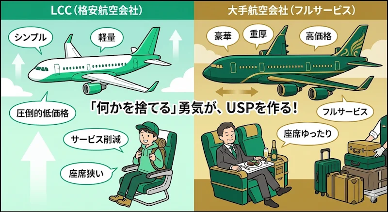 LCCは「移動さえできればいい」という層にターゲットを絞り、「サービスや快適さを捨てる」ことで、大手には絶対に真似できない「圧倒的な低価格」というUSPを実現しました。