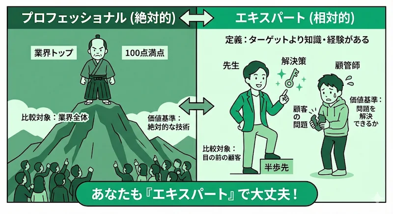 | 定義 | その道を極めた職人、業界の第一人者 | ターゲットより知識・経験がある人 |
