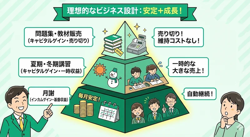 優秀な学習塾はインカムゲイン(月謝)を基盤とし、その上にキャピタルゲイン(特別講習、教材販売)を積み重ねる構造を持っています。