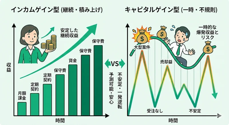 - ビジネスモデルで言えば、インカムゲイン型は「ストック型ビジネス」(継続契約)、キャピタルゲイン型は「フロー型ビジネス」(売り切り)に相当する。